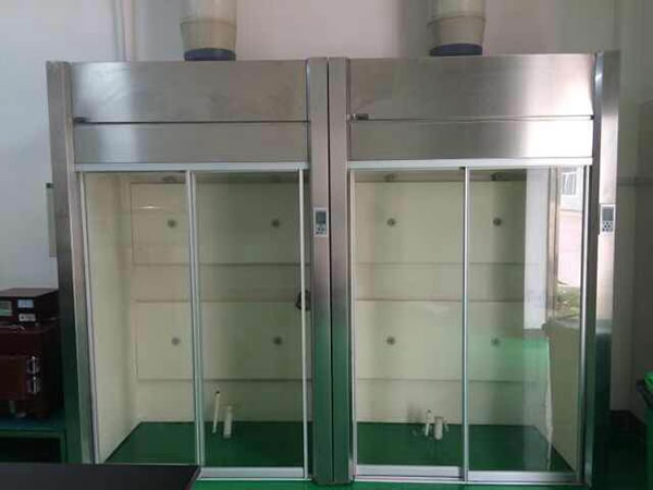 (5)傳動:雙懸玻璃門通過導軌、配重滑輪組、鋼索、配重等同步傳動,上下開啟靈活方便,噪音小。